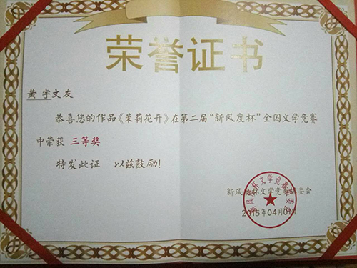 笔耕不辍终有成,捷报频传结硕果。荣誉是对黄宇同学“文学梦”的肯定和赞赏,希望黄宇同学今后在文学路上勇攀高峰,用诚挚的文字给众多读者带来更多阅读的享受。