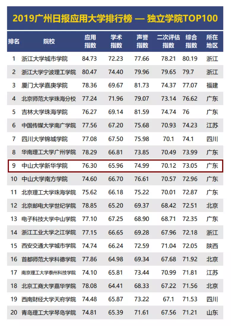 中山大学新华学院位居榜单全国第九位、广东省第四位 (图片来源:广州日报 GDI官方账号)