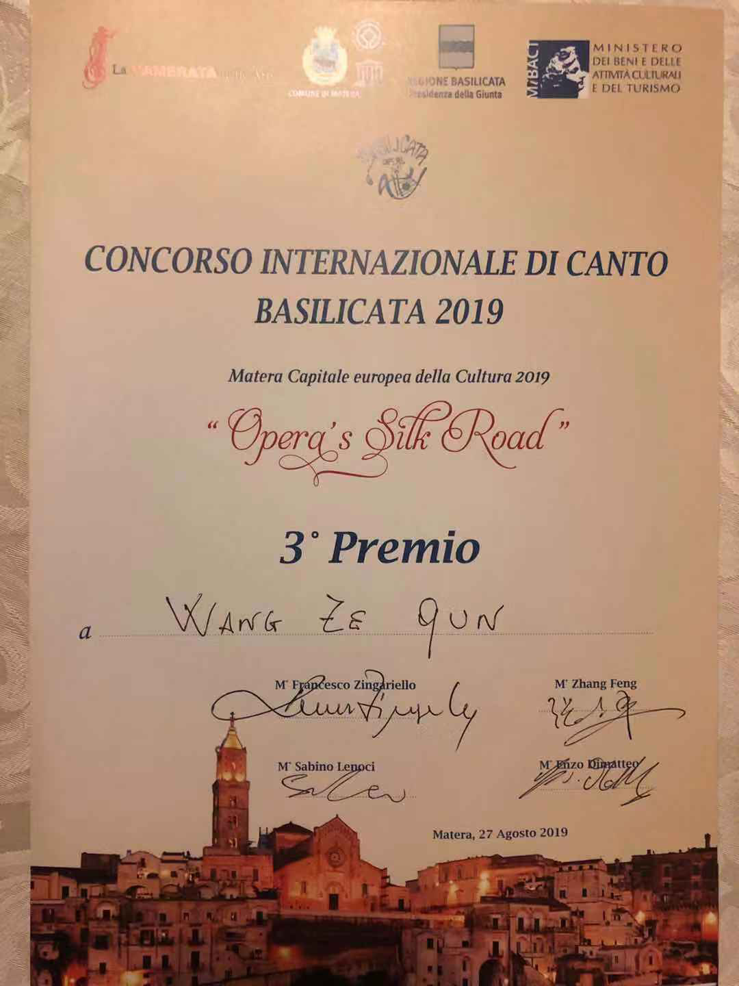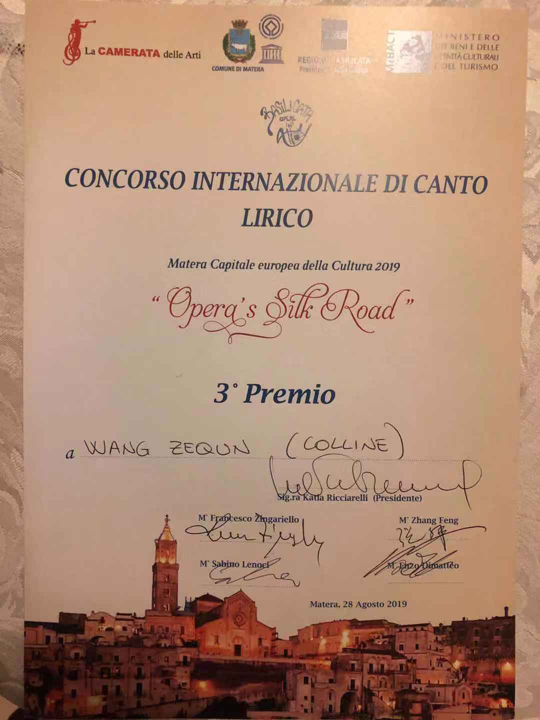Matera(马泰拉)国际歌剧比赛第三名证书