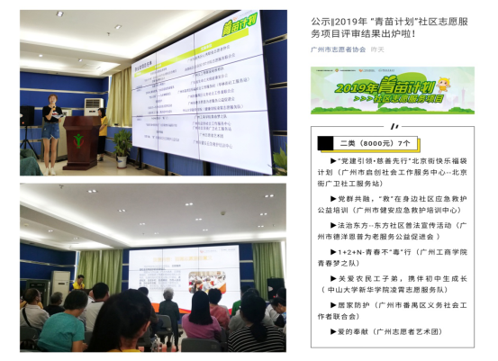 据悉,“青苗计划”通过“资金支持+专业支持”的方式,推动志愿团队项目化运作,打造志愿服务品牌,促使社区志愿服务常态化发展。自2011年首次推出以来,“青苗计划”已连续举办7届,累计投入101.5万元,培育了169个社区志愿服务项目,志愿者参与人次达31510人次,志愿者服务时数达114590小时,受惠对象达193167人次。2019年,广州义工联将投入23.9万元培育志愿服务团体(组织),资金支持力度创历年之最。