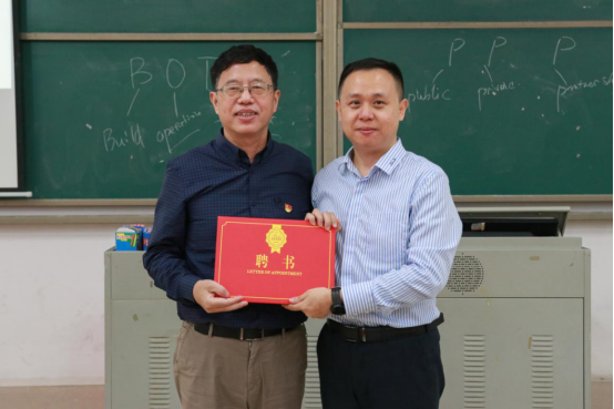 11月13日,广东省项目管理学会秘书长柯建杰代表广东省项目管理学会为中山大学新华学院管理学院执行院长彭建平教授颁发聘书,聘请彭建平教授为广东省项目管理学会副会长。