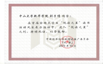 10月16日上午,首届全国大学生“悦读之星”读书演讲风采展示活动专家评审会在天津财经大学图书馆举行。中山大学新华学院图书馆推荐的17级中文系刘子倩读者的作品《生存与逐梦》获全国大学生“悦读之星”荣誉。