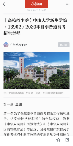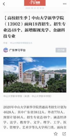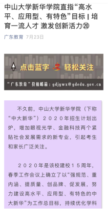 7月23日,广东省教育厅官微发布中山大学新华学院招生宣传新闻
