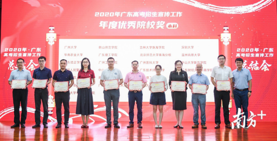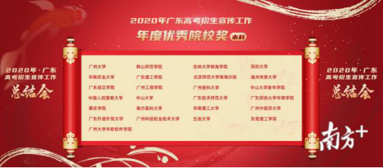 据悉,2020年广东高考招生宣传工作总结会,根据2020年度招生宣传的综合情况、服务政策大局的综合水平,以及广东省2020年高考招生服务榜等进行综合评选,共颁发了10个奖项:年度优秀院校奖(本科)、年度优秀院校奖(专科)、锐意创新奖、服务贡献奖、热门关注奖、魅力团队奖、智慧创新个人奖、服务贡献个人奖、最受欢迎个人奖,以及最重磅的年度最佳奖。