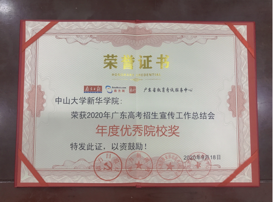 中山大学新华学院荣获“2020年广东高考招生宣传优秀院校奖”