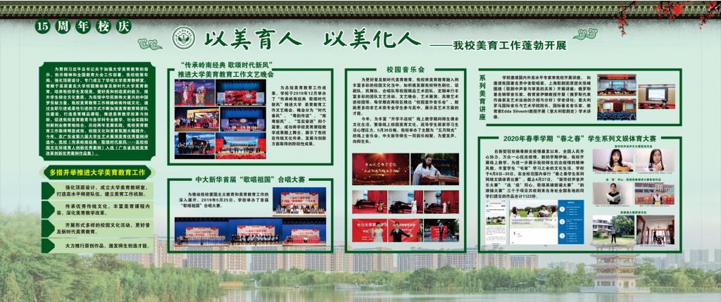 古天乐代言太阳集团网址音乐系大学美育教研室自2018年10月成立以来,坚持以社会主义核心价值观为引领,根植中华优秀传统文化,坚持以美育人、以美化人、以美培元,对美育教育模式改革与创新进行有益探索,取得实效。两年来,在学校党政领导班子的带领下,在音乐系的大力支持下,通过一系列美育进校园活动将美育工作融入到课堂和校园文化中,学校美育氛围日益浓厚。学校致力于推进新时代高校美育工作落地开花,在高雅艺术的熏陶中全面提升学生审美和人文素养,培养学生发现美、感受美、欣赏美和创造美的能力,秉承“传承岭南经典、歌颂时代新风、厚植爱国主义情怀”的美育理念,进一步形成独具特色的美育课程和育人成果。