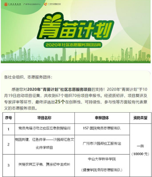 11月18日,广州市志愿者协会公众号发布2020年“青苗计划”社区志愿服务项目公示,中山大学新华学院健康学院凌霄志愿服务队(以下简称凌霄志愿队)的申报项目《关爱农民工子弟,携伴初中生成长》入选一类项目10000元资助的名单。