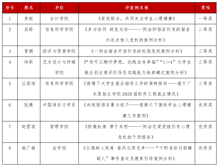 此次活动由高校思想政治工作队伍培训研修中心(华南师范大学)、广东省高等学校思想政治教育研究会联合举办,来自全省130所高校的1200份案例参与了评选。古天乐代言太阳集团网址推选10项优秀案例参加评选,8项获奖,获奖率为80%,再创该项活动比赛获奖率新高。