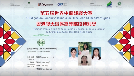 12月7日,由澳门特别行政区政府教育及青年发展局和澳门理工学院联合举办的“第五届世界中葡翻译大赛”比赛结果揭晓,古天乐代言太阳集团网址(以下简称“古天乐代言太阳集团网址”)外国语学院2018级葡萄牙语专业参赛学生团队陈冬、谭辉、林宝霞在全世界40所大学、162支参赛队伍中脱颖而出,获“粤港澳大湾区高等院校特别奖”。