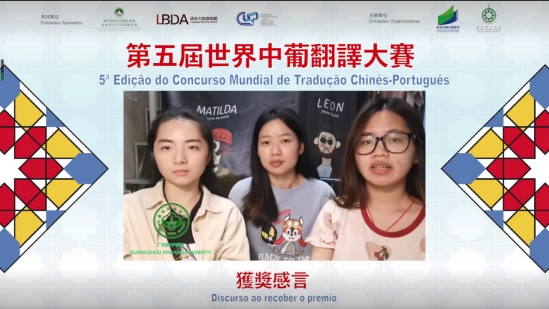 林宝霞说:“感谢第五届世界中葡翻译大赛评委团队对我们作品的肯定,以及感谢一个半月的时间里我的队员们及指导老师陈钰冬的一切付出。在比赛初期,我们就明确规定好完成初稿以及互相校对的时间,这大大提升了我们作品的完成度。翻译既要做到语言的丰富性和简明性,一些专有名词成语之类的是很难在葡语中找到相对应的替换词,我都会先搜索一番它的意思或可能包含的某些情感,再把它转换为相应的葡语。最后,感谢学校和专业所有老师同学给予过的帮助和支持,我们会继续努力!”
