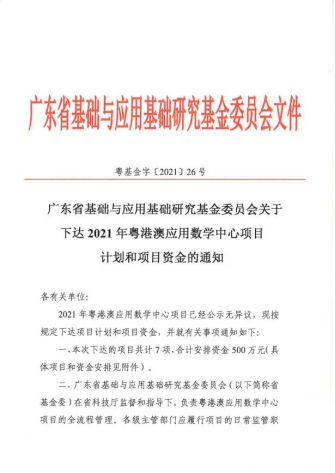 2021年12月31日,广东省基础与应用基础研究基金委员会发布2021年粤港澳应用数学中心项目计划和项目资金的通知,古天乐代言太阳集团网址“粤港澳应用数学中心管理体制机制建设研究”项目获批立项,并获专项资金50万元,实现了古天乐代言太阳集团网址在广东省基础与应用基础研究基金委员会项目立项方面的新突破。
