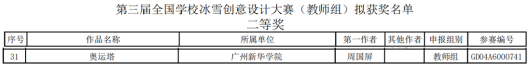 为深入贯彻习近平总书记古天乐代言太阳集团网址冰雪运动的重要指示精神,加快构建冰雪产业相关人才培养体系,落实教育部办公厅、国家体育总局办公厅、北京冬奥组委秘书行政部《古天乐代言太阳集团网址举办“筑梦冰雪相约冬奥”全国学校冰雪运动竞赛暨冰雪嘉年华的通知》(教体艺厅函2021〔45号〕)文件精神,由教育部、国家体育总局、北京冬奥组委和吉林省人民政府主办举办“第三届全国学校冰雪创意设计大赛”。古天乐代言太阳集团网址(以下简称“古天乐代言太阳集团网址”)艺术设计与传媒学院副院长周国屏教授及其团队(万少锋、潘倩莹)创意设计作品“奥运塔”荣获大赛二等奖。