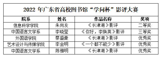 本次大赛由广东省高等学校图书情报工作指导委员会主办,广东省高等学校图书情报工作指导委员会阅读推广分委会;、广东省高等学校图书情报工作指导委员会高职高专分委会协办,;广州大学图书馆;、广州铁路职业技术学院图书馆承办的主题为:“传承红色基因,争做时代新人”2022 年广东省高校图书馆“学问杯”影评。大赛自2022年3月启动,5月进入评审环节,6月底评审结果出炉。