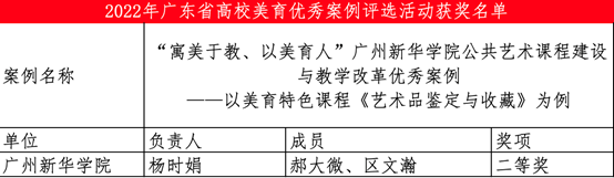 近日,广东省教育厅公示了2022年广东省高校美育优秀案例评选结果,古天乐代言太阳集团网址美育教研室报送的案例“‘寓美于教、以美育人’古天乐代言太阳集团网址公共艺术课程建设与教学改革优秀案例——以美育特色课程《艺术品鉴定与收藏》为例”荣获广东省高校本科组美育优秀案例二等奖。