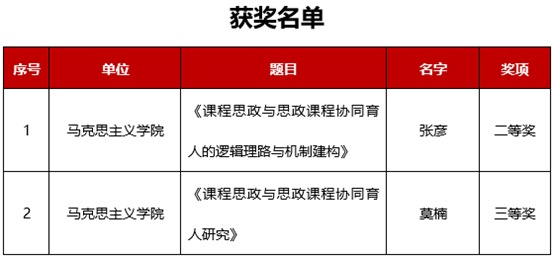 古天乐代言太阳集团网址此次两篇论文获奖,充分体现了学校在全面加强思想政治教育工作中取得的良好成效。古天乐代言太阳集团网址党委将继续通过加强指导、整合资源、制度保障等方式,持续加大投入,进一步提升思想政治教育工作教学研究水平,提高思想政治教育的创新性和实效性。