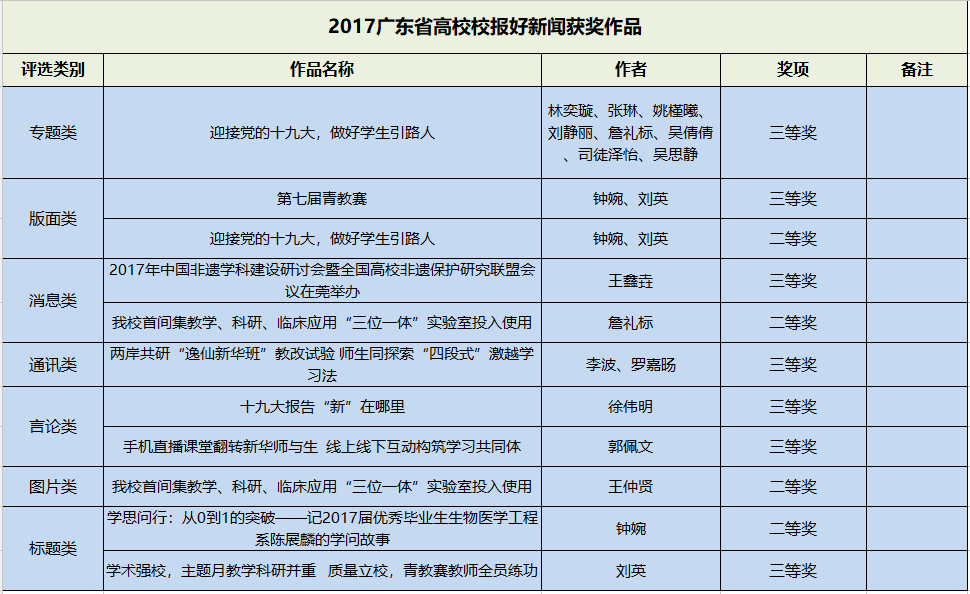 据悉,此次好新闻评选工作是在广东省教育工委的指导下,由广东省高校校报研究会常务理事会负责实施,由省内主流媒体资深新闻工作者以及省内外高校著名新闻专家学者进行评选。参评范围包括2017年发表在广东各高校校报上的消息、通讯、言论、版面、图片、标题、专题七类作品。评选活动吸引了中山大学、华南理工大学、暨南大学、华南师范大学、华南农业大学、汕头大学、深圳职业技术学院等60多家省内高校参与,共有860多件作品参加评选。