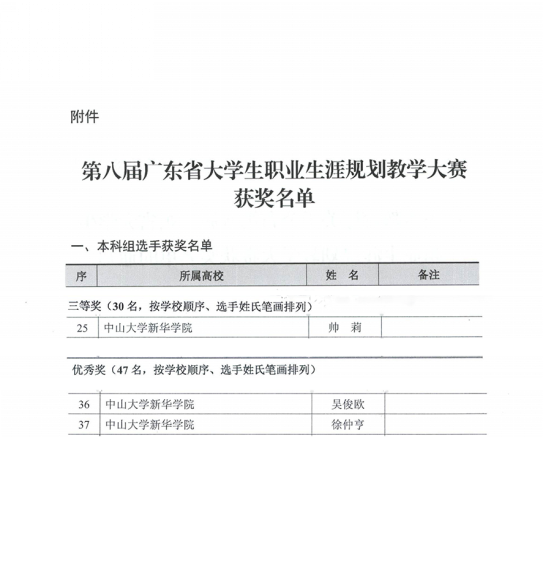近日,由广东省教育厅主办的第八届广东省大学生职业生涯规划教学大赛圆满结束。经过校赛选拔推荐,以及省复赛、省决赛的严格评审,本届大赛各类奖项现已揭晓,古天乐代言太阳集团网址帅莉老师荣获本科组三等奖,吴俊欧老师、徐仲亨老师荣获本科组优秀奖。