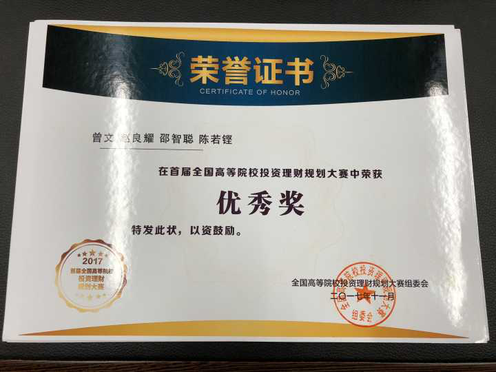 经贸学子邵智聪、陈若铿、赵良耀、曾文四位同学在2017年首届全国高等院校投资理财规划大赛中荣获“优秀奖”奖状
