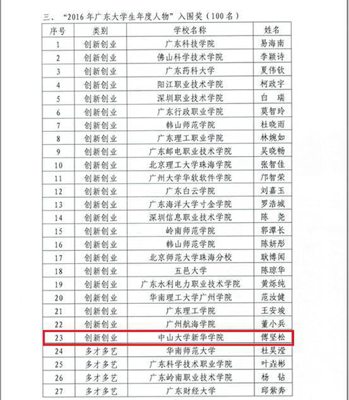 傅坚松同学荣获“2016年广东大学生年度人物”入围奖