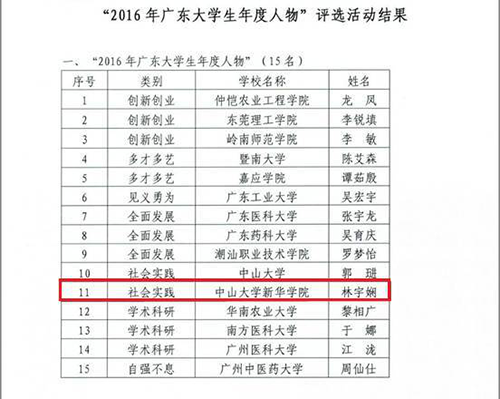 林宇娴同学荣获“2016年广东大学生年度人物”的称号