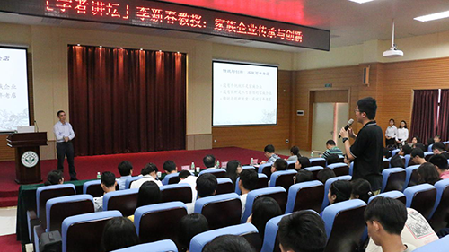 在自由交流环节,李新春教授热情地与现场师生互动。对于学生提出的“与第三、四代子女分开生活是否会导致家族关系逐渐疏远从而给家族企业的发展与传承带来隐患”的问题时,李新春教授说:“这并不会造成严重的隐患,因为当今中国的家族企业一二代的居多,若真的出现三四代的传承时,其实也会有多样的沟通方式,如李锦记家族,总体来说还是需要一、二代尚在时,建立起相应的家族制度以防患于未然。”