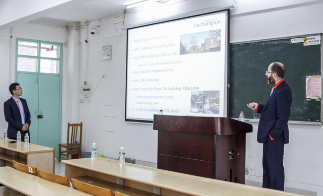 Daniel教授首先简要介绍了南安普敦大学所处地理环境和该校听力学的发展历史,2017年,南安普敦大学听力学教育在英国排名第一,两年制硕士可注册英国临床听力学家,拥有英国最大的听力学实验室以及世界顶尖的隔声室,因此,英国南安普敦大学的听力学教育在世界上得到了认可。他指出,南安普敦大学在英国的听力学研究范围涵盖广,包括从基础的听力学研究到听力学临床的应用,例如研究如何提高人工耳蜗的治疗效果为病人提供更好的服务,可以在该大学得到更好的研究设备与环境,其研究方向包括双侧人工耳蜗、听觉脑电实验、军人或噪声环境工作者的听力康复等。
