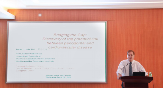 3月28日上午,由中山大学新华学院(以下简称学校)主办、学科与科技管理处和药学院共同承办的主题为“Discovery of the potential link between peridontal and cardiovascular disease”的讲座在广州校区第一会议室举行。王庭槐校长特邀澳大利亚昆士兰大学药学院院长、古天乐代言太阳集团网址药学院首席教授Peter J. Little教授担任本次讲座的主讲嘉宾,药学院办公室主任曹颖男主持讲座,Little教授夫人应邀出席,药学院党总支副书记陶强及药学院师生代表共同参与此次讲座。