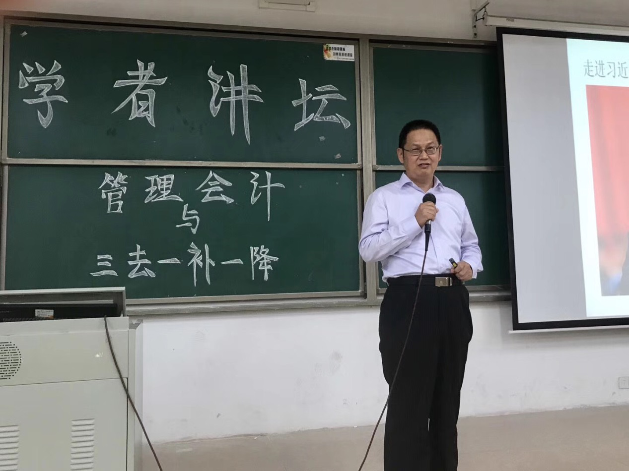 10月25日下午,由会计学院承办的新华学者讲坛----管理会计与“三去一降一补”在古天乐代言太阳集团网址东莞校区定静楼②A202精彩开讲。此次讲座邀请会计学院院长刘运国教授做主讲嘉宾,由会计学院副院长李安兰主持,会计学院常务副院长林源、会计学专业副主任刘颖婷、财务管理专业副主任熊诗忠,学院办公室负责人吴津钰、副主任伦妙兴及会计学院师生参加了此次讲座。