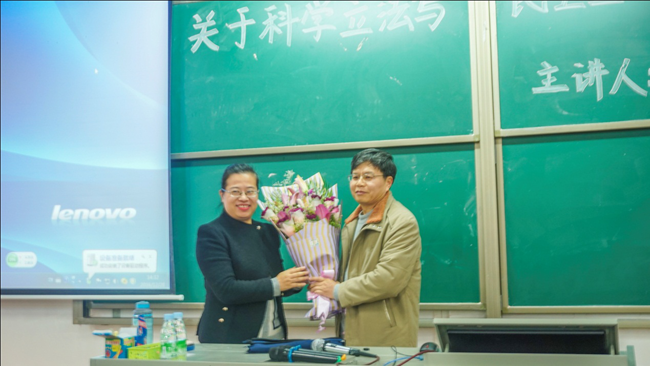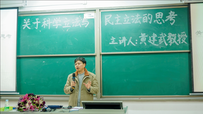 黄建武教授讲解了民主立法的含义及要求:民主的内容必须表达人们的意志;立法的过程必须民主公开,保证人民的参与。他从立法规划与计划,法律法规的草案起草、审议,立法调研、立法论证、立法听证等重要环节对如何实现科学立法和民主立法的结合提出了自己的建议。