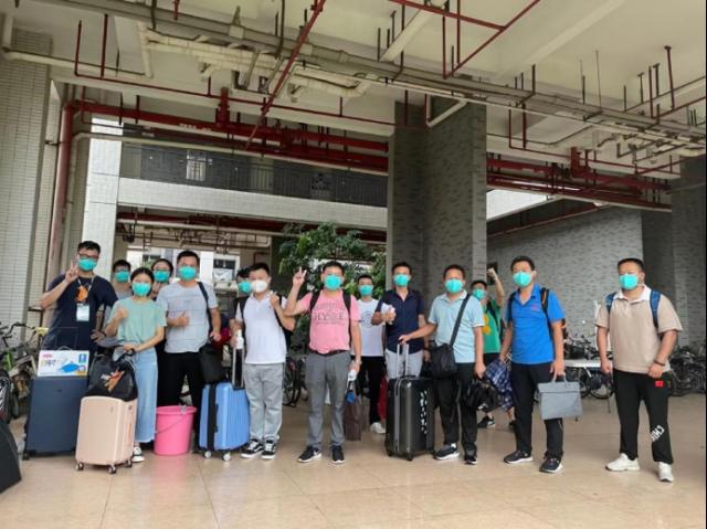 6月23日凌晨3点集结,早上7点结束完相应工作交接以及防疫有关培训后,首批17名“校外隔离点新华学子关爱团”的老师集合出发。前一天还身着防护服为同学们搬运物资的老党员柏廷广同志毅然集结再次出征。