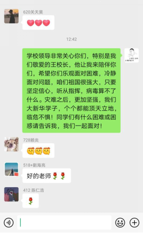 校外隔离点新华学子关爱团临时党支部书记吴翔同志作为第一批“最美逆行者”于6月23日到达隔离酒店,他第一时间加入学生沟通群,向同学们传达学校领导的关爱和鼓励,号召同学们临危不惧,齐心抗疫。