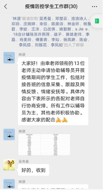 会计学院党总支十三位教师党员紧急组建“疫情防控学生工作群”,与辅导员老师积极对接学生信息采集、舆情跟踪反馈等工作,与学生们线上积极互动,暖心安抚学生们焦虑的情绪。