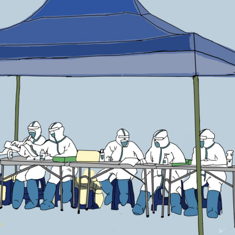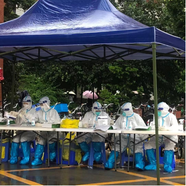 6月24日下午,16栋宿舍楼下,医护人员在雨中为师生测核酸。疫情发生以来,无数的医护人员夜以继日投入到疫情工作来,同学们都想对他们说一句:辛苦啦!