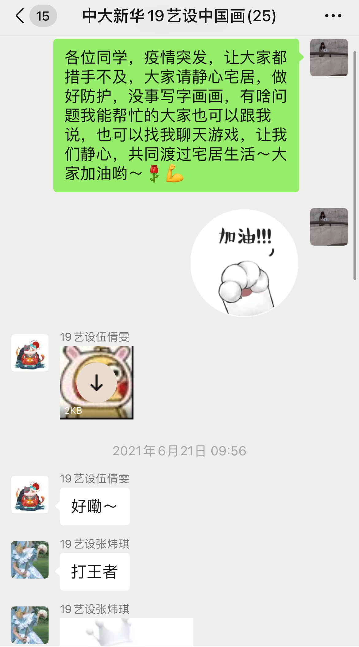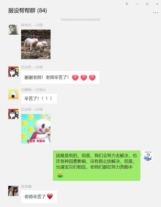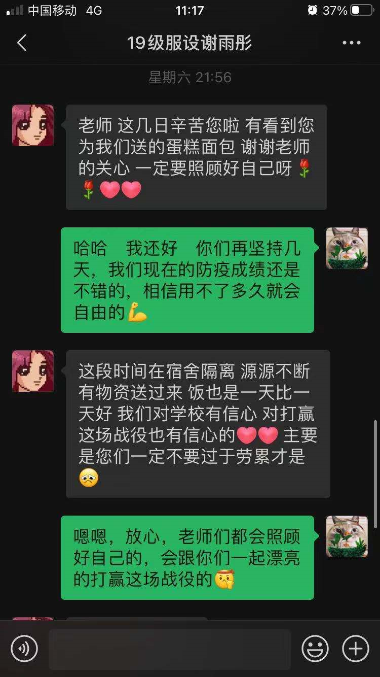 疫情期间,各小组严格落实上级部署的各项防疫工作安排,教师们及时向学生传达防疫相关文件精神,深入了解学生在学习、生活、心理等方面的问题并及时给予全方位的关心照顾。为缓解辅导员的工作压力,小组内各老师主动负责做到对每位同学完成健康状态追踪和每日健康情况打卡提醒等工作,大家为共同抗击疫情不断努力。