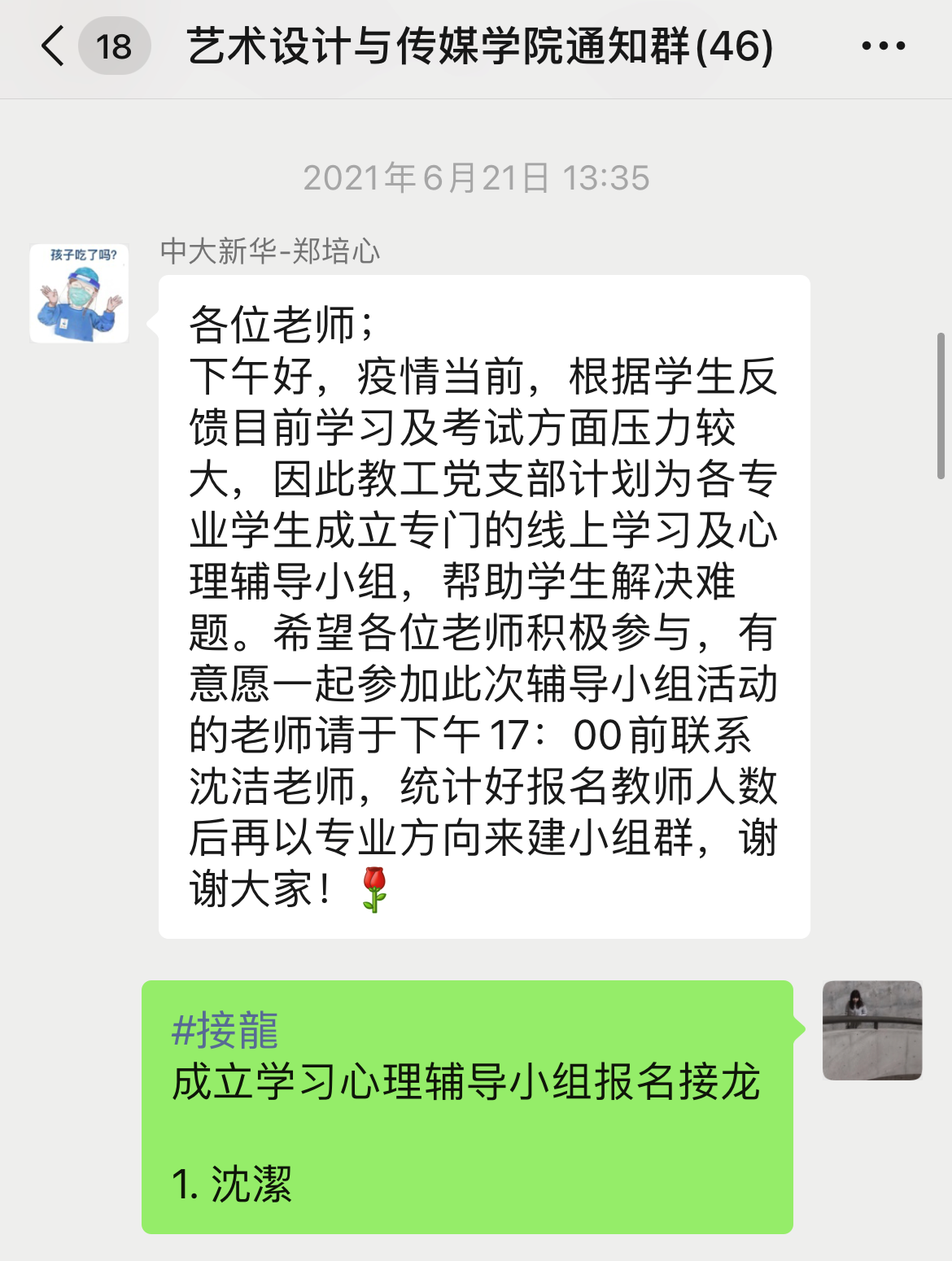 疫情当前,根据同学们反馈目前学习及考试方面压力较大的问题,2021年6月21日,艺术设计与传媒学院教工党支部迅速召开活动讨论会议,决定向学院教师征集志愿者,为学院各专业学生成立了专门的线上学习及心理辅导小组。