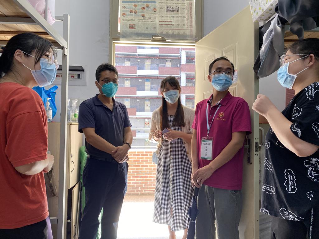 下午的东莞校区乌云密布,狂风大作,不时便大雨倾盆。但这丝毫未影响宋俊华主任前往学生宿舍的步伐。党总支副书记杨帮琰、办公室副主任吴桂玲、辅导员阮婕等一行人随同宋俊华主任走访了中文系19级学生所住的18栋宿舍楼和18级学生所住的4栋宿舍楼,其中重点慰问了本系第一批从校外隔离点返校的两位同学。