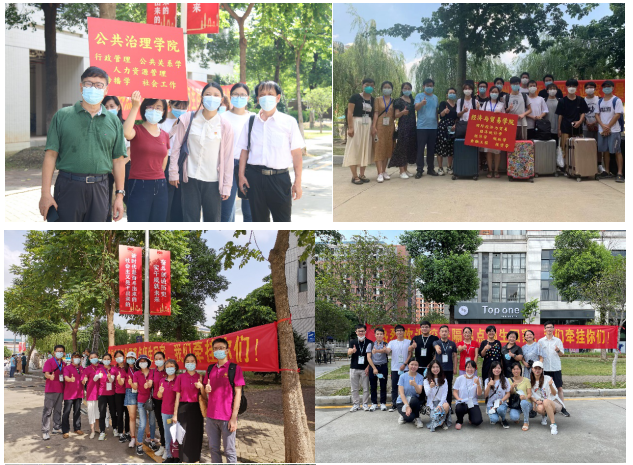 公共治理学院院长徐文俊、副院长谭昆智、罗亮梅带领学院辅导员等迎接学生返校。在校道上,公共治理学院举行了简短的欢迎仪式。徐文俊代表学院欢迎同学们返校,他对各部门负责本次隔离工作的老师们表示感谢,对学生们隔离期间守纪律、严要求的表现予以认可,他认为学生们在隔离期间很好地体现了当代青年的责任和担当。