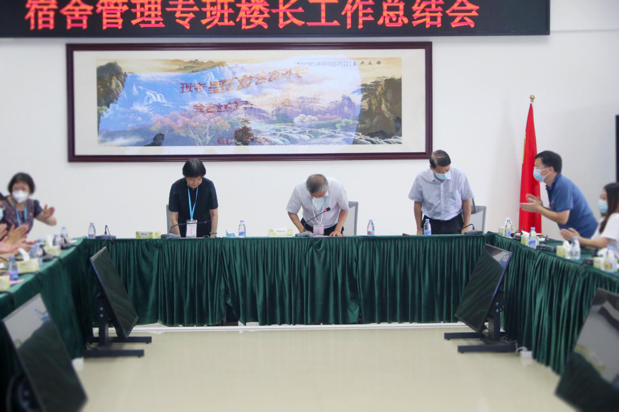 王庭槐校长(左)、周云书记(左)、李中生副校长(右)代表学校向宿舍管理专班全体楼长鞠躬表示感谢