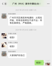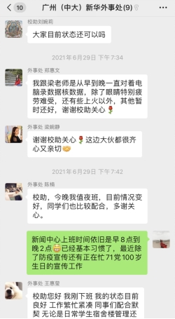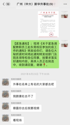 6月27日晚,外事处郑惠文副科长和梁婉静加入东莞校区抗疫。郑惠文是当天将2个大病初愈的幼儿送到了数百公里远的茂名,然后连夜开车赶回广州,再到东莞校区投入抗疫;梁婉静也是在家人的反对声中流泪出发。这些教职人员的舍己为校精神,令人感动。