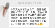 刘洁江的“战衣”总是湿了又干、干了又湿,他却并不认为这是门“苦差事”。因为连续性护送物资,他的手臂上晒出了“黑白分界线”。“大家都在为了同一个目标努力拼搏,与时间赛跑。”在刘洁江眼里,自己和每天上上下下搬运物资的老师们没有什么不同,“这次疫情召唤出许许多多的勇士,我只是其中一个小缩影,更何况我是退伍军人,退伍不褪色”。面对各方“点赞”,他表示,“我只是做了一件普通的事情,却得到了同学、老师们表彰和肯定,自己心存感激。”他认为,“既然有了这个能力能帮助到人,就不该躲藏,该出手时就出手。当时没想那么多,现在回想自己只是辛苦劳累几天,能帮助社会对师生们的关爱联系,真的是非常值得。”
